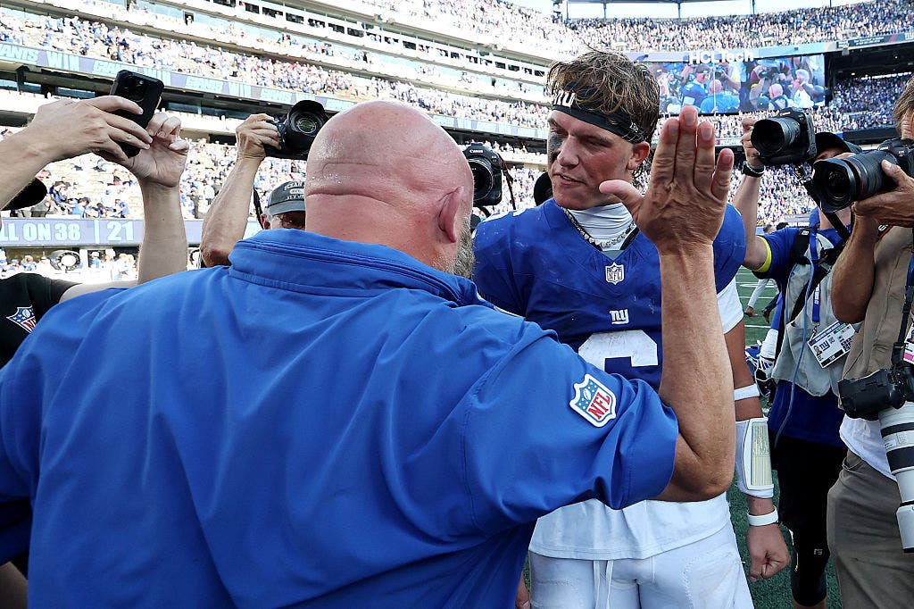 Jaxson Dart and Giants coach Brian Daboll celebrate New York’s win over the Chargers in the rookie quarterback’s first NFL start. (Photo by Al Bello/Getty Images)