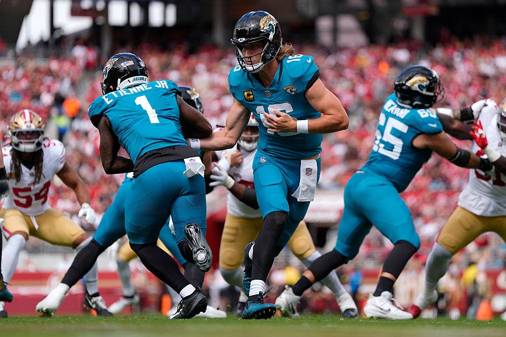 The Jaguars have started the season 3-1, but that’s mostly because of Travis Etienne Jr. and the running game rather than anything Trevor Lawrence is doing. (Photo by Thearon W. Henderson/Getty Images)
