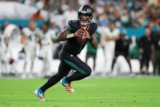 Tua Tagovailoa threw two touchdown passes to lead the Dolphins to their first win, but he lost his WR1 for the rest of the season when Tyreek Hill suffered a dislocated left knee and torn ligaments. (Photo by Logan Bowles/Getty Images)