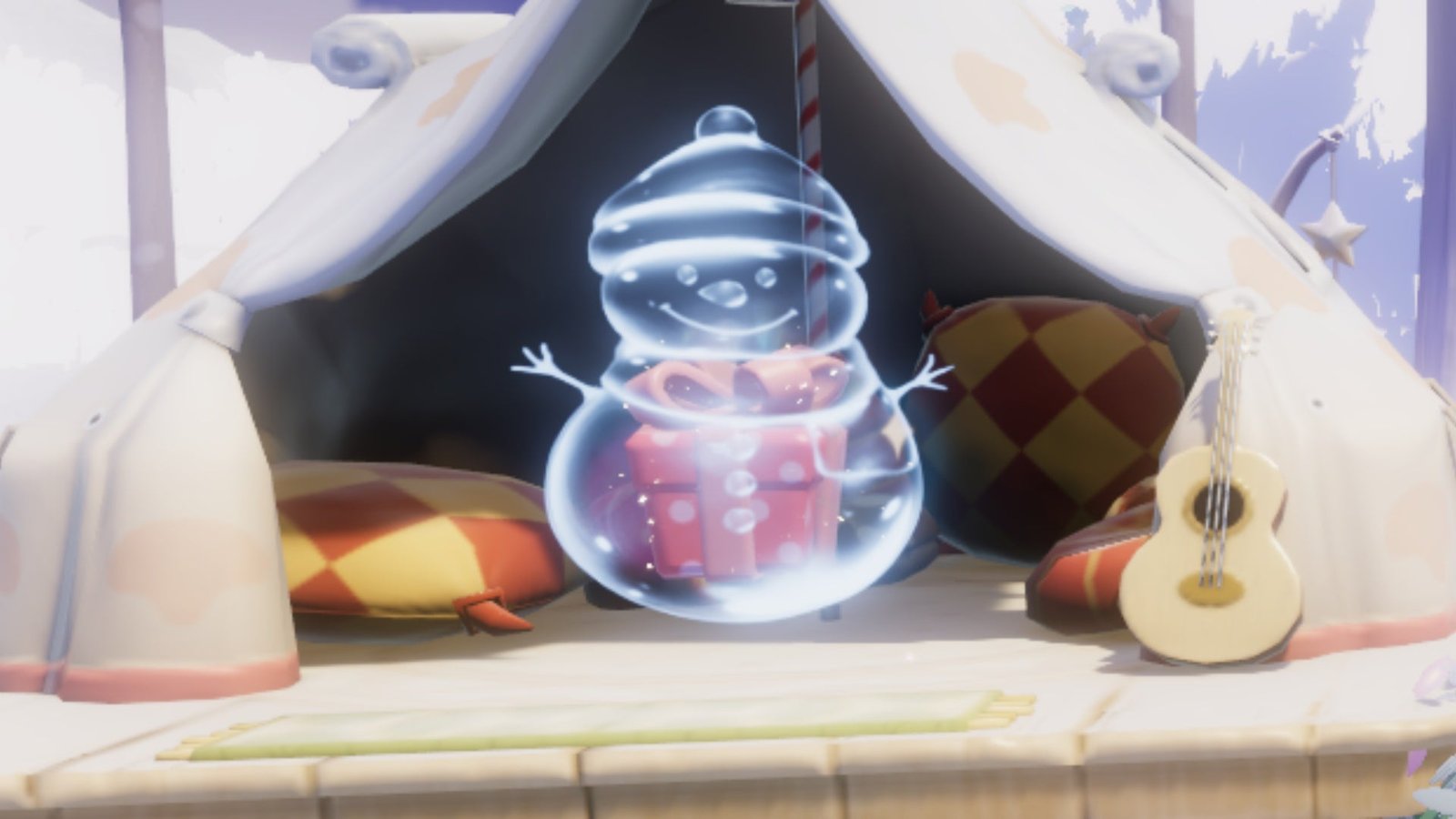 After building the snowman for Eric during Winter Frost Season on the rooftop at Onsen Mountain, find the bubble looping around its peak. Stand on the snowman’s head for the optimal jumping angle to grab it.