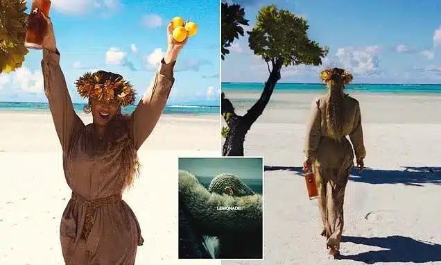 Beyoncé, 44, marked the 10-year anniversary of her iconic album Lemonade with a vibrant Instagram post on Thursday. The photo captures her on a sun-drenched beach, holding three lemons and a bottle of SirDavis American Rye Whisky from her Moët Hennessy collaboration.