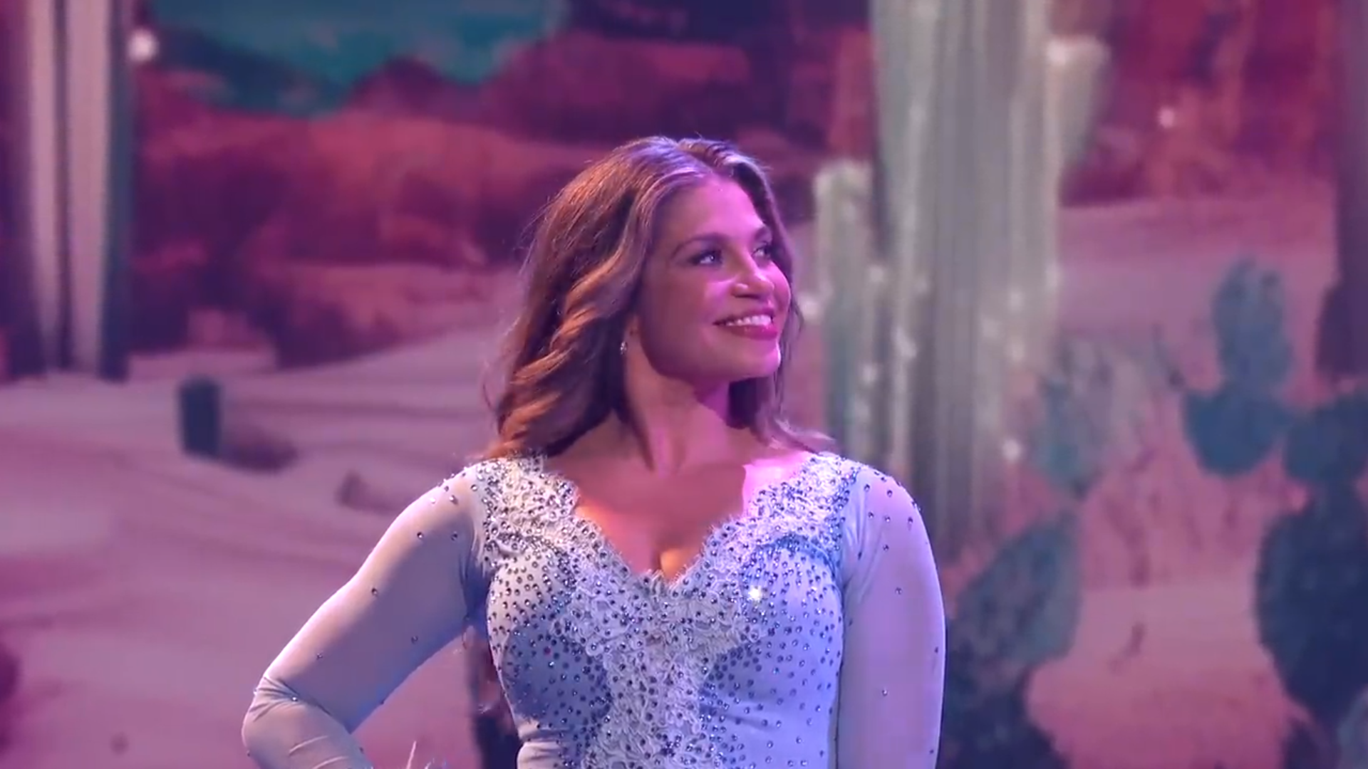 Whitney Leavitt smiling on Dancing With The Stars.Whitney Leavitt smiling on Dancing With The Stars.