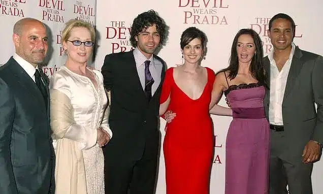 The current ensemble marked a significant upgrade from the 2006 premiere. Back then, Hathaway wore a simple red cowl-neck dress, Streep a white beaded cocktail dress, and Blunt a strappy purple gown with lace details.