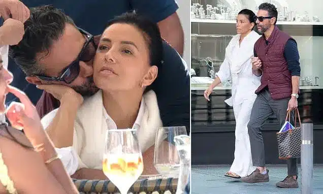 Longoria paired a linen shirt with matching trousers and casually draped a knitted sweater over her shoulders. Bastón, father to their seven-year-old son Santiago, wore a burgundy gilet layered over a dark sweater and chinos. He shielded his eyes with sunglasses, planted a kiss on her cheek, and gallantly carried her handbag as they strolled hand-in-hand.