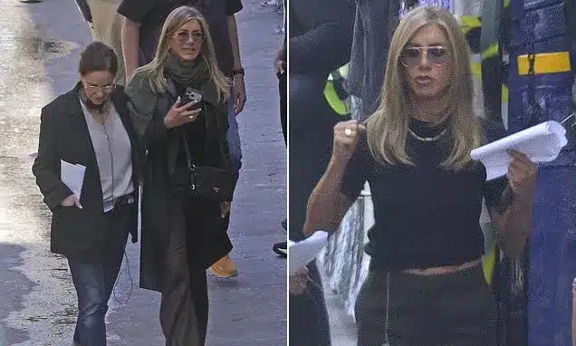 The 57-year-old actress appears fully immersed in her role, clutching a script while rehearsing dramatic lines. A production assistant accompanies her, holding another copy of the scene. Aniston sports a short-sleeved black top, loose dark pants, flip-flops, aviator sunglasses, and perfectly styled hair, exuding effortless style.