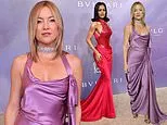 Hudson, 46, captivates in a lilac silk gown with asymmetrical draping that flows down her legs. She pairs the look with a silver diamond necklace and later adds a light brown fur jacket draped like a cape. Her collarbone-length hair falls straight with a center part, complemented by purple eyeshadow, pink blush, and matte lips. Black strappy heels complete the glamorous style.