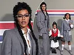 Taylor wore her dark hair in two long braids while seated front row. Other notable guests included influencer Alix Earle, 25, in a prep-inspired gray suit dress with a matching tie, button-up white skirt details, sheer knee-high stockings, and black heels. She shared a TikTok with sister Ashtin Earle, captioning it ‘Off to @Thom Browne @GQ giving Serena and Blair.’