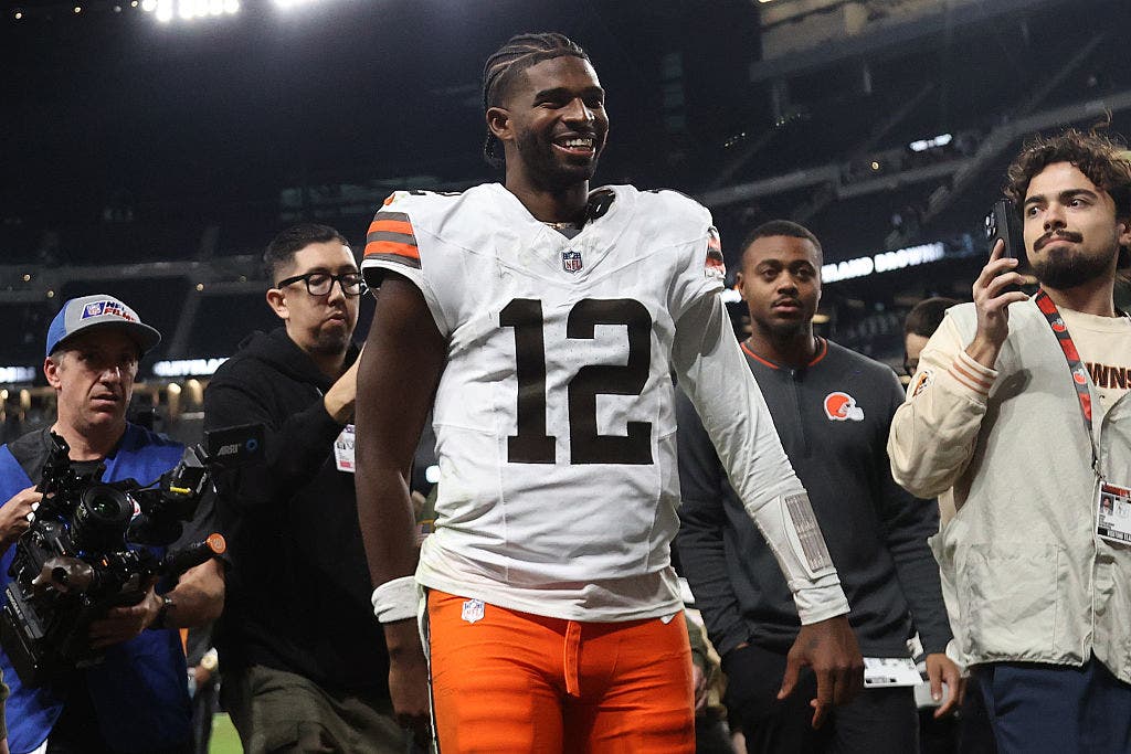 In Week 12 in opposition to the Raiders, Shedeur Sanders as a result of the primary Browns quarterback to win his first profession begin in 30 years. (Picture by Ian Maule/Getty Photos)