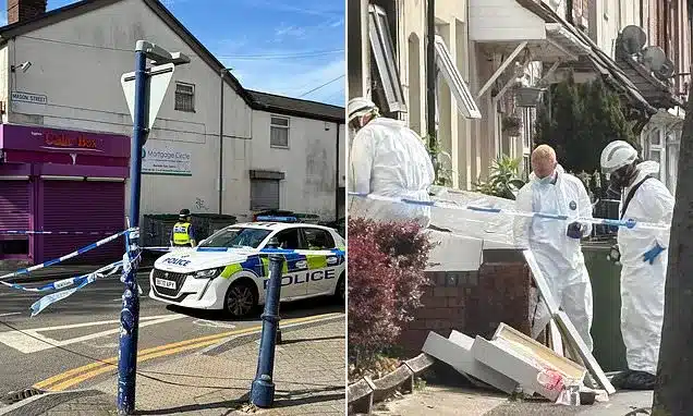 The scene showed signs of intense damage, including scorched walls, smoke-blackened ground-floor windows, a smashed first-floor window, and debris such as a mattress scattered outside. A police cordon remained in place through Saturday afternoon, with forensic officers entering the property in protective gear.